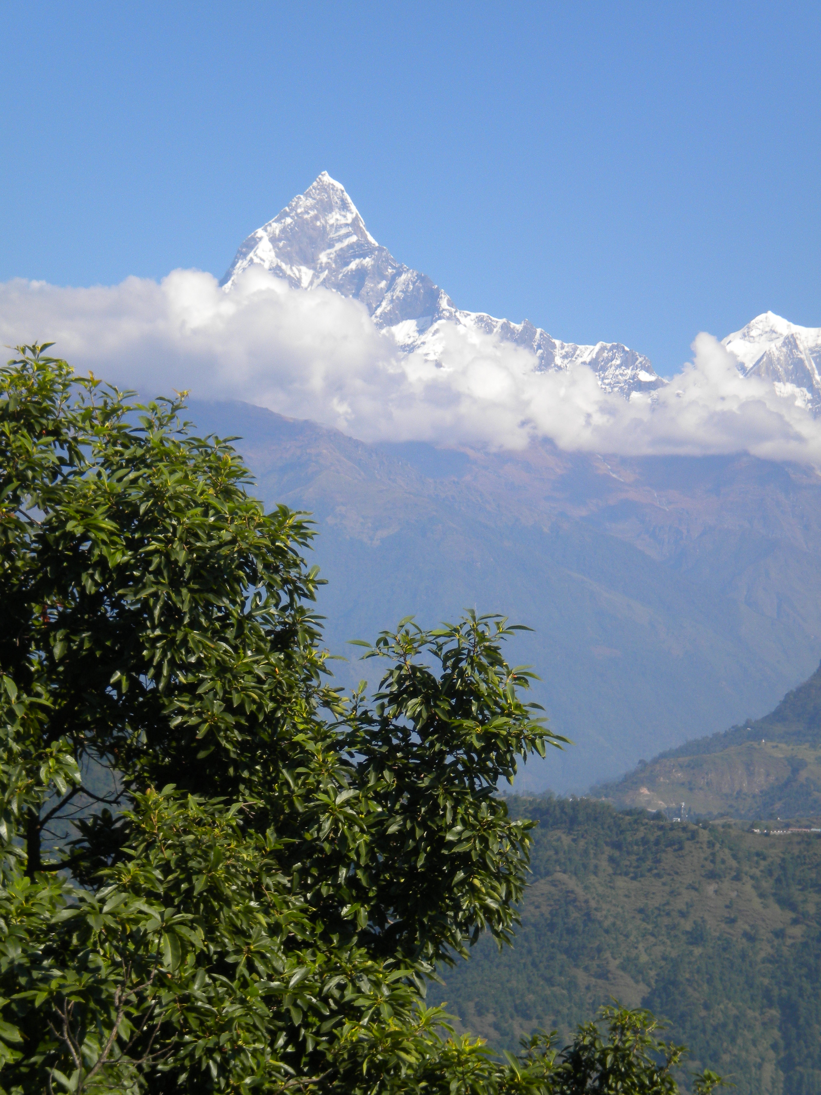 I was in Pokhara that October, on a mission trip–holding a mini-conference ‘s with a selection of Pastor’s wives in the region. The little hotel/bed & breakfast I was staying in had a charming breakfast seating area outdoors–and guess what my view was???? If my chair was facing the mountain view–Machapuchare was looming above me. I loved it! (I have so many pictures of that trip–that mountain!) Here is my journal entry:
