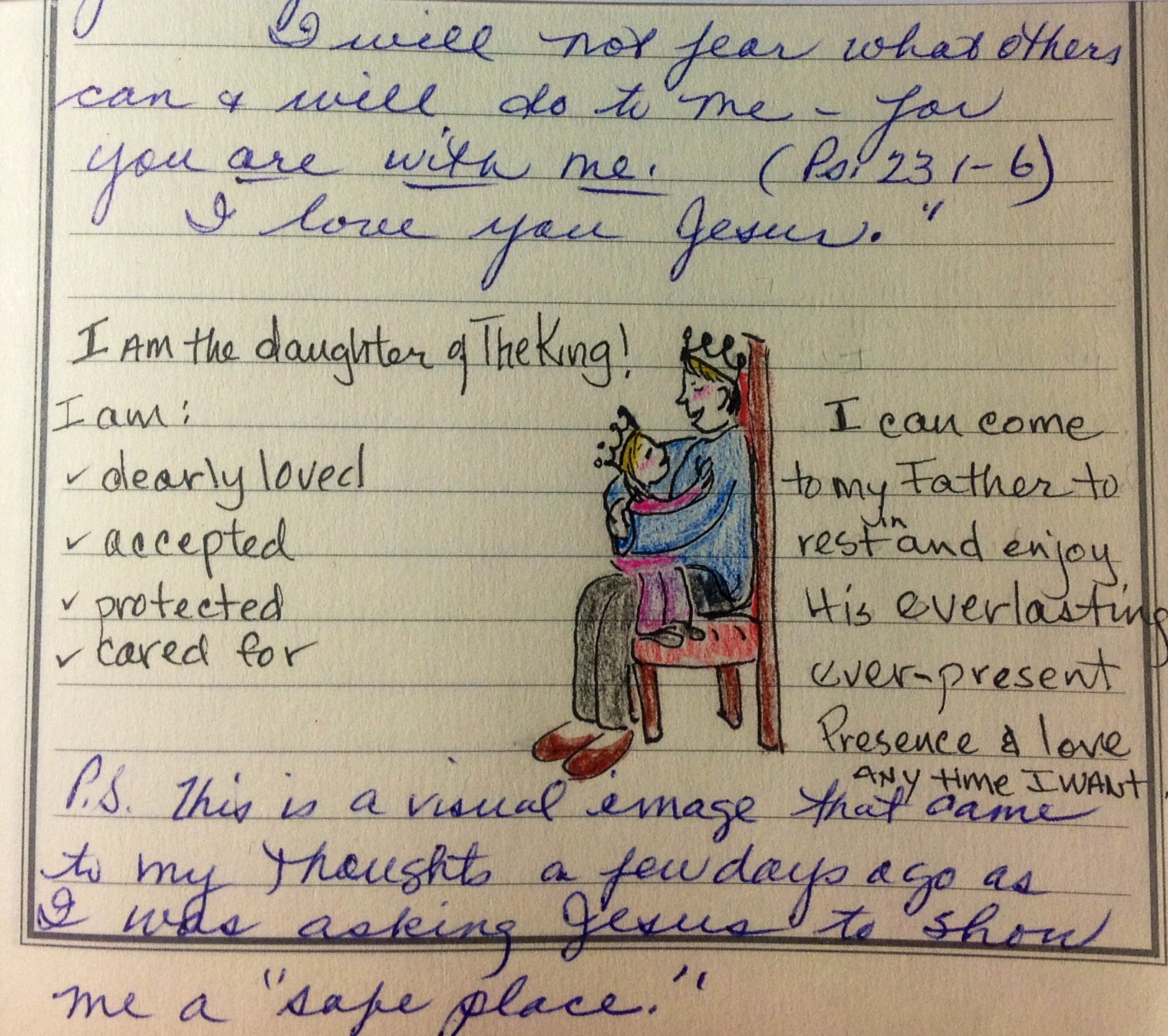But as I waited, I realized that God was hearing my prayer–and this was my picture–for me–of a ‘safe place.’ I pondered this thought then I sketched a rough drawing of what came to mind, in my journal. When I finished, I found my self weeping. That father had a crown on his head, and the child also had a crown. The realization hit me with force! That was me in his lap–so close–so loved. A wave of love and being loved washed over me. Alone, I wept freely. It felt so good. Calm filled my heart and mind. I wanted to bask in that feeling–but as life is, my time ran out and I needed to do other things.